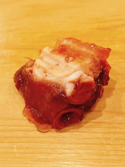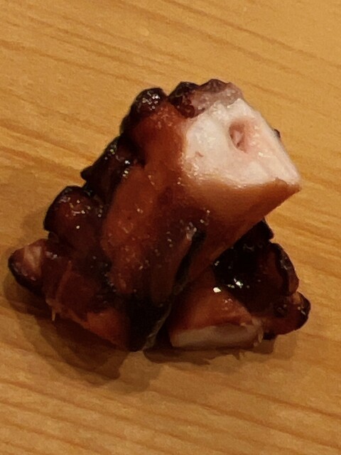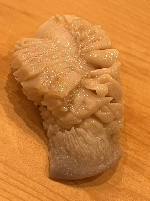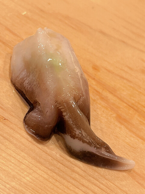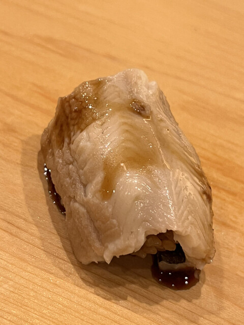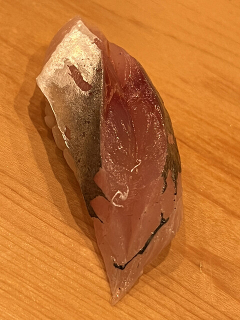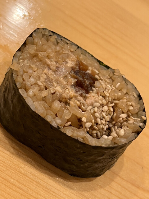 旬の加治木の漬けに悶絶すれば、甘海老のタタキの煎り酒風味にお酒が進む進む。黒潮大蛇行が終焉したせいか、今年の秋刀魚は太くて身が厚い。肝と合わせたその握りをハムハムハム。