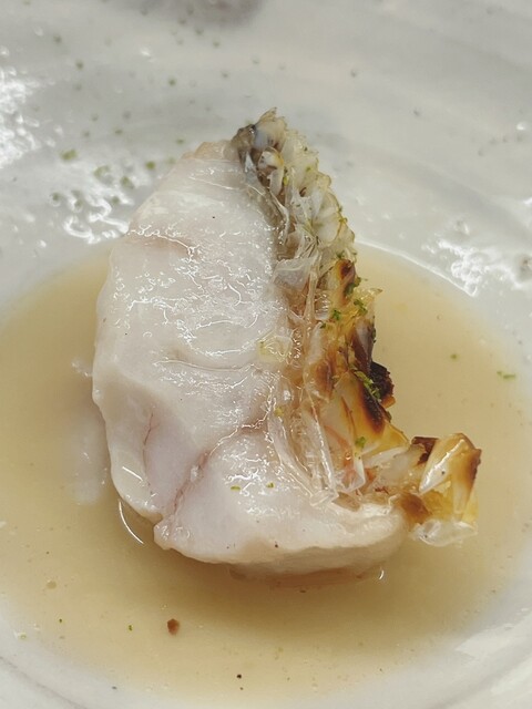 伊勢海老の蒸し物。万願寺が寄り添い、お出汁には生姜汁を垂らして清涼感を加えます