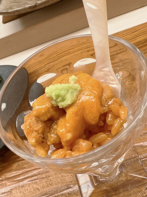 大間のムラサキウニと天草の赤ウニです。これまでいただいたウニパフェの中でナンバーワンでした