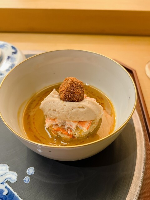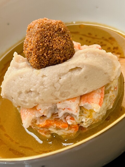 トッピングは香箱蟹の外子。真ん中は富田林産の海老芋を白味噌でペースト状に仕上げました