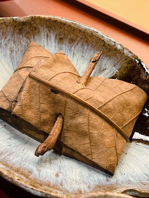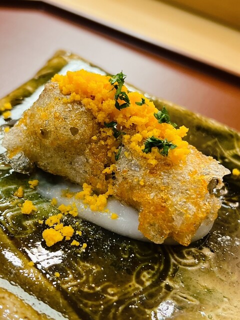 三重の答志島のトロ鰆を燻製し、食用菊りゅうのひげ@新潟で包みました。トッピングは柿。タイハーブを駆使した餡が全体をまとめます