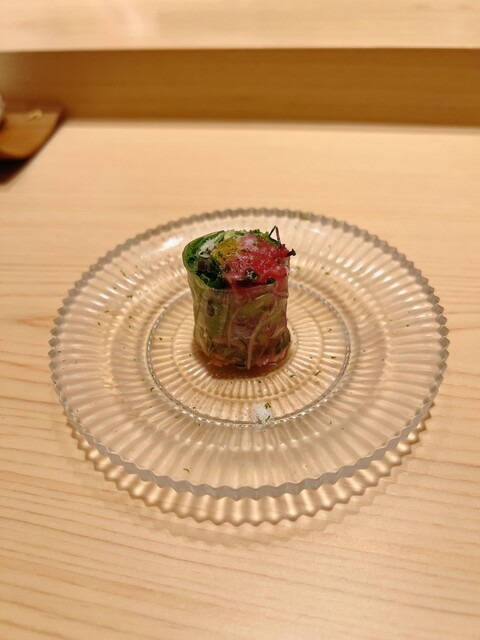 マイクロハーブと鮪の生春巻き、佐島の蛸に特大ボタン海老といった定番に加え、今夜は初めての海鮮テリーヌ。