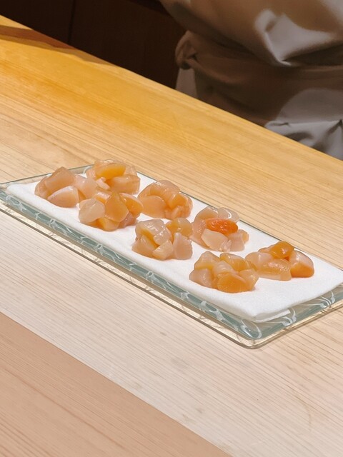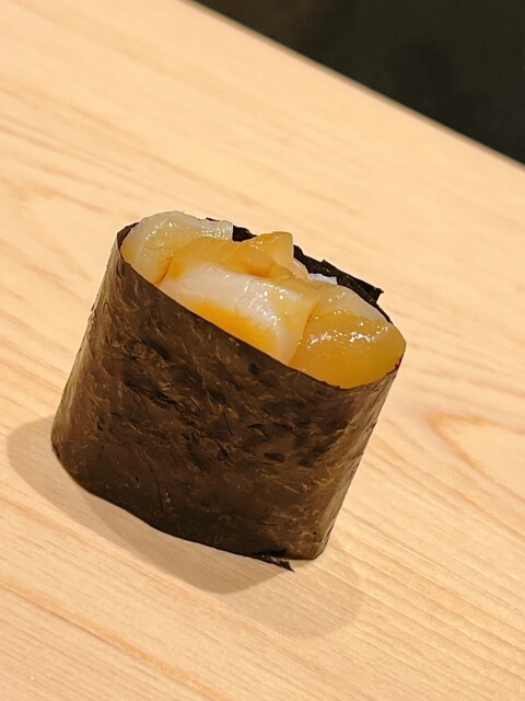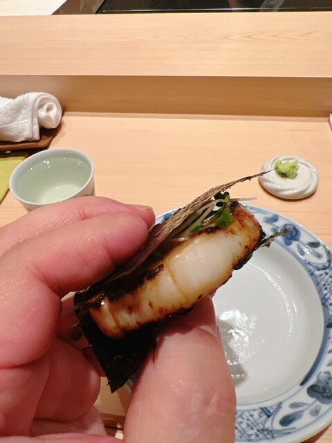 帆立の磯辺。スプラウトを和えたソースが斬新な味わい。ただ炙っただけの巷の磯辺とは段違いの美味さ