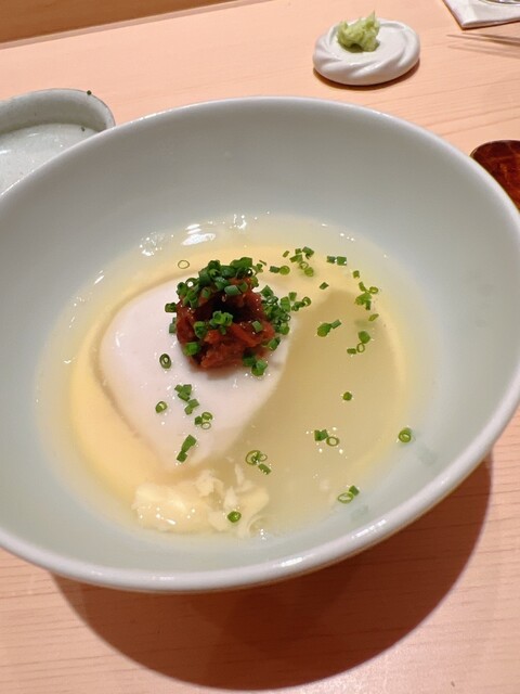 河豚の白子に鴨頭ネギとタタキ梅をトッピング