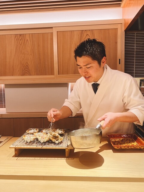 香箱の内側を軽く焼いてキチン質の焦げた香りを抽出。内子と外子と脚肉の混ぜ混ぜに温かいジュレをよそう伊藤親方。