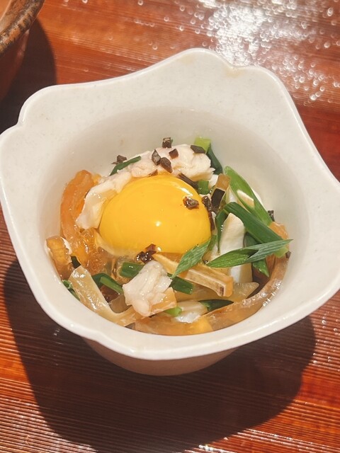 河豚皮、身皮のポン酢和え。うずら卵の甘味がポン酢の酸味を和らげます。