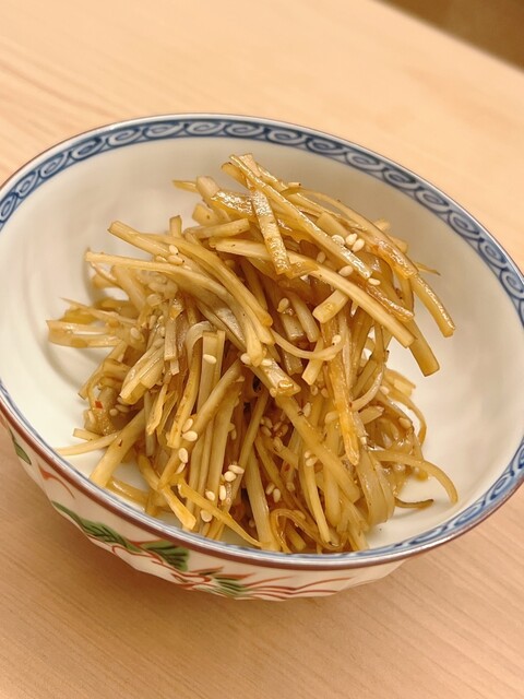 箸休めにキンピラ牛蒡をいただきました。シンプルなこれが抜群に美味しい