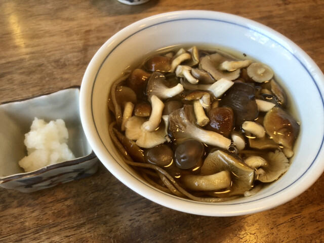 なめこと本しめじの2種類、きのこの香りと食感を存分に楽しめる温かいお蕎麦。