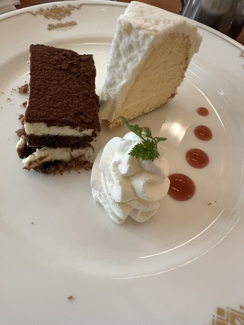 これで結構満腹な感じですが、デザートはフランクフルタークランツに独自のアレンジを加えたというユーハイムクランツとティラミスの盛り合わせで、ボリューミーです。ユーハイムクランツはドライな感じなので添えられたホイップクリームとクランベリー(?)ソースでいただきます。ティラミスは甘さ控えめで軽い感じにしてあるのでパスタの後でも食べやすいですが、やはり少し残してしまいました。