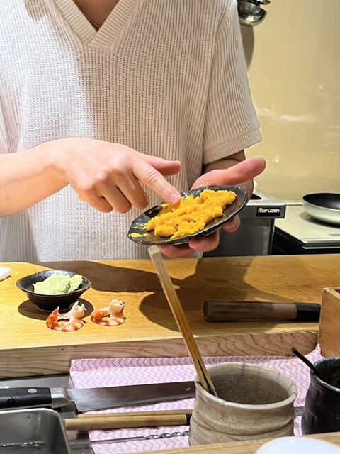 そして極めつけは「印籠烏賊」!「これが江戸前鮨の元祖」とおっしゃる大将。烏賊を蒸して、脚を細切れにして鮨飯と和えたのを、烏賊の胴体に詰め込みます。これはひとまずラップに包んで寝かせて置き、雲丹の握りが登場します。雲丹は炙って出てきます。香ばしくて美味しい