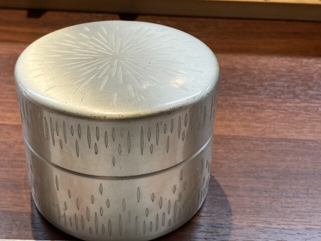 円柱状の容器に入れられており、蓋を開けると茶筒のような形になっています。