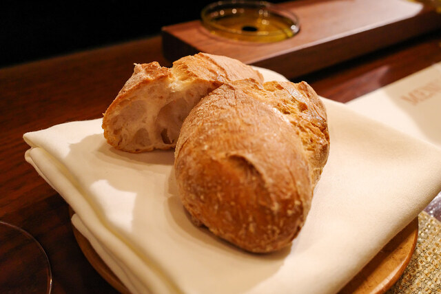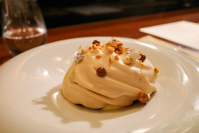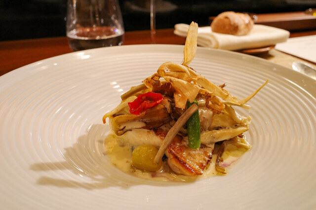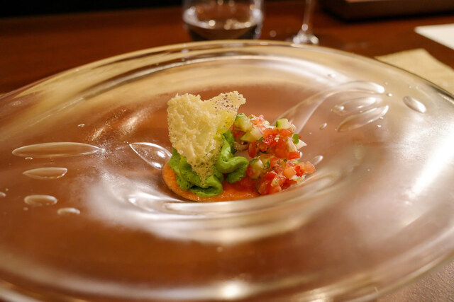 店内はテーブル席とカウンター席があり、今回は初カウンター席です。シェフの様子がよくわかって面白いです。 オーダーしたのは、MENUHOPE@6,000円 進藤シェフは六本木にあるロブションの副料理長だった方。以前のお店(ジョンティアッシュ)もミシュラン一つ星でしたので、ランチといえど6,000円で食べられるのはコスパが良い。 ・コウイカのミキュイ フルーツトマトのクーリーとルッコラのエスプーマで・フランス産フォアグラのプランシャ焼き 和栗の渋皮煮とセップ茸を添えて(+1,500円) フォアグラの甘味と和栗の甘味。どちらの甘味もケンカをしません。・広島県三次市九重栗南京のまろやかなポタージュ 香ばしいクルトンを添えて クルトンも添えてありますが、カボチャの種もお皿の上に添えてあります。 もちろんこれも食べられますし、食べました。・岩手県産ホロホロ鳥のパロティーヌ 様々な茸のア・ラ・クレームとサラダヴェールを添えて 連れのメインです。・北海道産松皮鰈のポワレ 牛蒡のピューレと舞茸を添えてシャンパンバターソースで 私のメイン。 舞茸の香りがとても良いです。 先ほどのセップ茸もそうですが、秋はキノコの香りがとても良いですね。 牛蒡のパリパリとした食感も面白い。 そしてとにかくバターソースがうまかった!・洋梨とヘーゼルナッツのプラリネのアンサンブル カシスの酸味でエスコートして 久々にガッツリフレンチをコスパ良く食べられました。