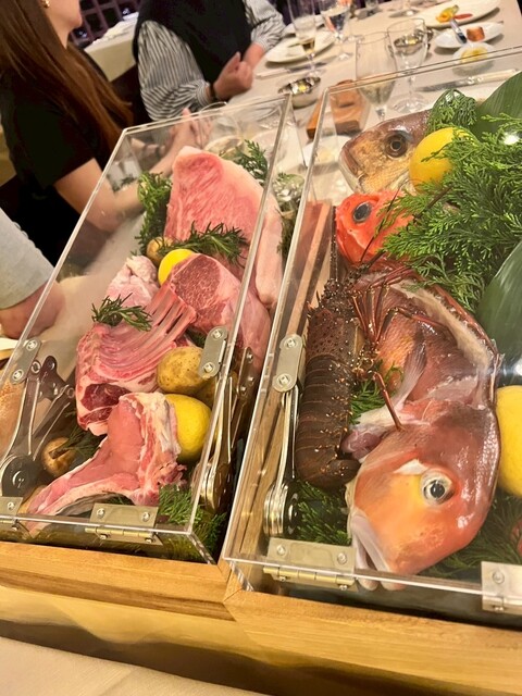 ② 接客サービス 入店直後からホールスタッフの丁寧な案内と笑顔が心地よい。テーブルの脇に運ばれたクリスタルケースを開け、シェフ自らが「今日は北海道産の仔羊と伊豆の金目鯛をご用意しました」と食材の産地や特色を説明。料理提供のタイミングは絶妙で、会話が途切れないペース配分。ワインはコース中4杯を通してペアリングを提案してくれ、グラスが空く頃に最適な一杯を注ぐ気配りが光る。食材の扱い方やおすすめの食べ方も詳しくレクチャーがあり、料理をより深く楽しむガイド役としてのサービスが行き届いている。