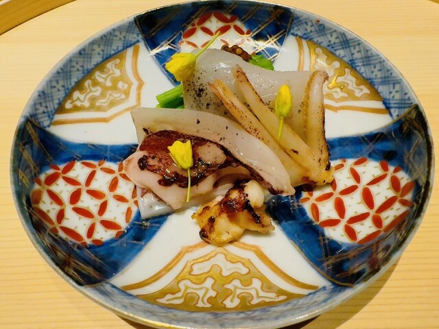 ・先付け 大分産猪を炭火焼き,国東半島,メス,メカブ