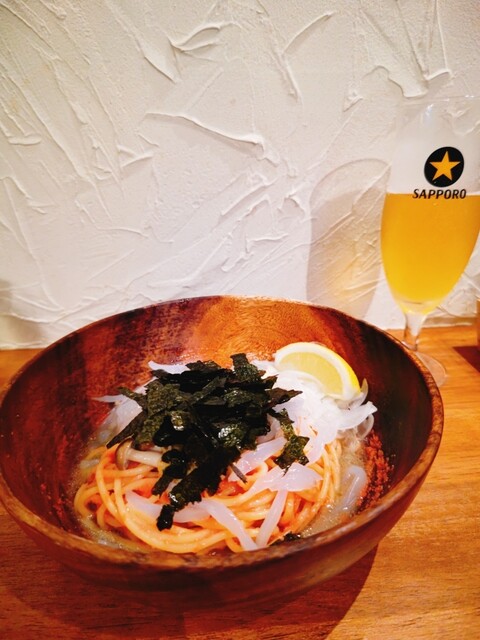 玉ねぎにレモンを絞って、海苔をかき分けながらひと口。うーんおいしい…人気なのわかりますね。納豆のとろみとコクがパスタに絡んで、明太子としめじとあうあう。時々タマネギで味変です。