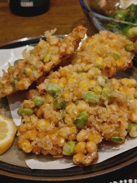 お通し、お刺身盛り合わせ、ネギマ、つくね、生牡蠣、白子ポン酢、菜の花、おでん、コーンと枝豆のかき揚げ、おにぎり。なんかもっと他にも食べた気がするけど思い出せず。