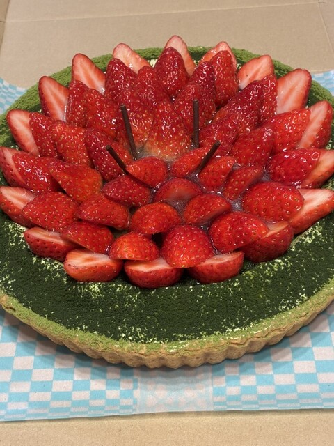 娘の誕生日ケーキ。いろいろと悩んで、希望を聞いた結果、キルフェボンの抹茶とイチゴのタルトに決定。かなり奮発!!予約をして受け取りに行きました。キレイで大きめなイチゴたちが目を惹きます。味はもちろん美味しい。イチゴの甘さと酸味、抹茶のほろ苦さと甘味、甘さ控えめなカスタードにパイ生地。これらが一体となって、最高です。キルフェボンは、よく記念日に買っていましたが、今回、久しぶりの購入。改めて、ここのタルトの美味しさを実感。ご馳走様でした。