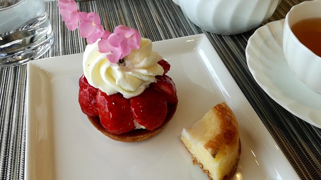 ナイフで切って、タルトと苺と生クリームをセットで食べると、