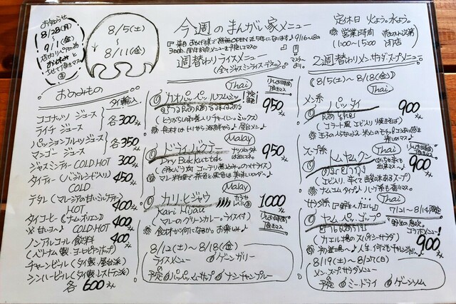 メニューが変わってゆくので、通えば色んなタイ料理・マレーシア料理を楽しめます。今回は特に、ゲーン・ガリー、カオ・ラートナー・ムー、パッキーマオムーが好きでしたが、それ以外も初めての料理が楽しいです。