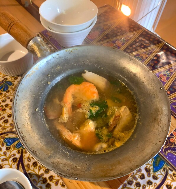 ポテーク(900円):タイ料理。エビ・アサリ・魚などの出汁が出た、トムヤンクン風のちょい辛の海鮮スープ。あったまります。こちらも現地の器で。屋台感があります。