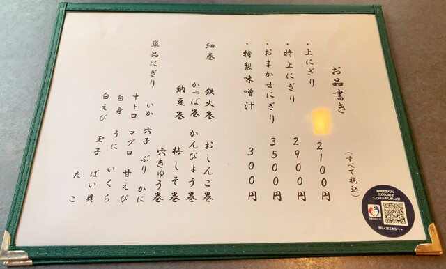 おまかせにぎり(3500円):お寿司は全体にネタが大き目で、酢飯は殆んど印象に残りません。いわゆる技巧派では無く、しかし丁寧に仕事をされたのか、何れもストレートに美味しく、しかもウニを含めて余計な臭みや雑味が無く爽やかです。