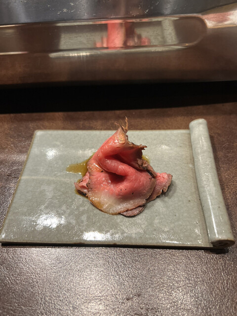 布のようなお肉にタレがかかった一品です。