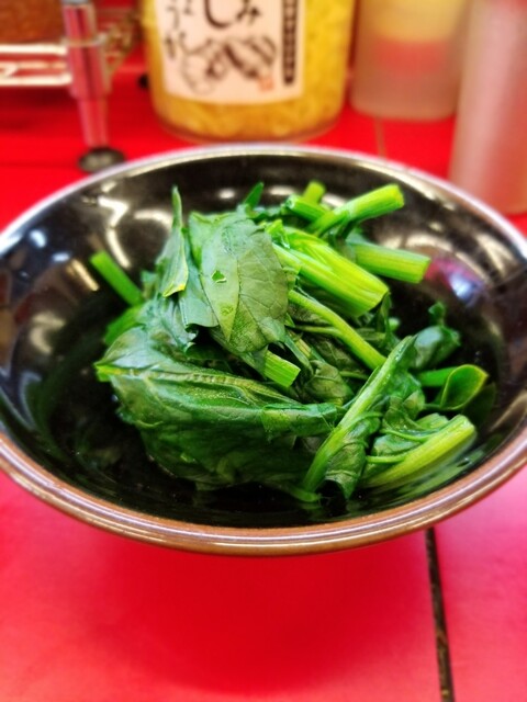 具はのり、チャーシュー、ほうれん草でトッピングの純生ほうれん草は別皿で提供される。ほうれん草のボリュームがスゴく多すぎたかと思ったけど家系の濃さにはこのくらいが適量かも。