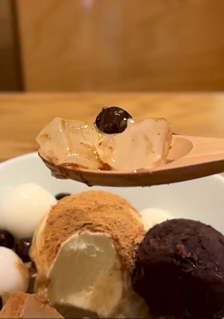 白玉がもちもち、豆と寒天のバランスもよく、最後に残った黒蜜まで匙で舐める始末。