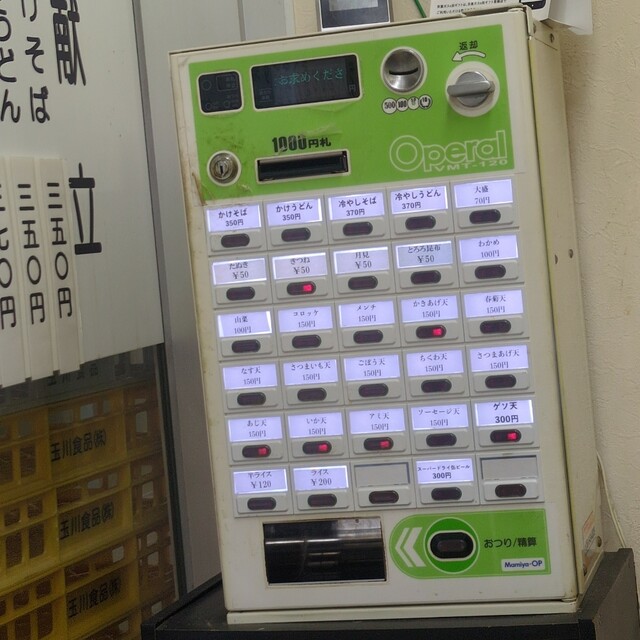 初訪問はゲソ天が売り切れ(実はその後売り切れの文字が消えてたけどw)だった為、かけそば+春菊天にしたが、2度目の今回券売機を見てみると、ゲソ天のボタンは売り切れが点灯してない。