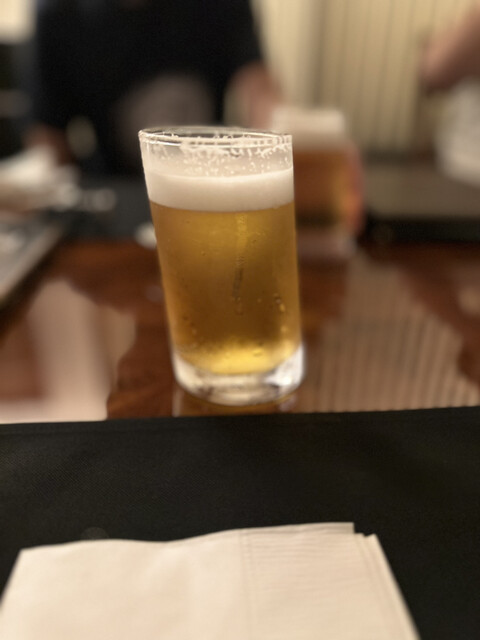 ドリンクはビール、斜めになった面白いグラスが出てきてまず楽しませていただき、