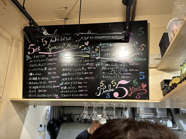 金曜日の夜のピークの時間に奇跡的に席が空いてました!入口は5周年お花がたくさん♩