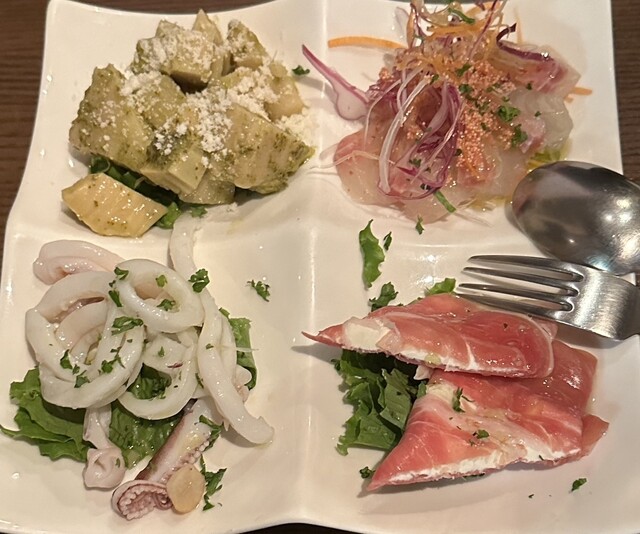 前菜盛り合わせは左上から、カボチャとゴルゴンゾーラ、レンコンのバルサミコ和え、タコのマリネ、生ハム&クリームチーズ
