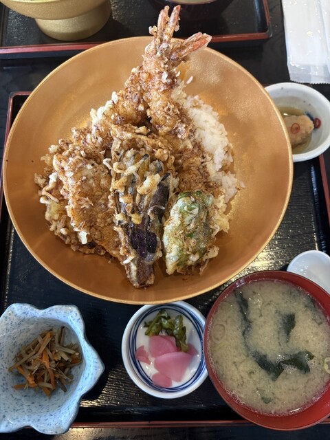 注文したのは海老天丼。大ぶりの海老天に、季節の野菜天がたっぷりと盛られた豪華な一杯。朝からはさすがに食べきれず、お持ち帰りパックをいただけたので助かりました。