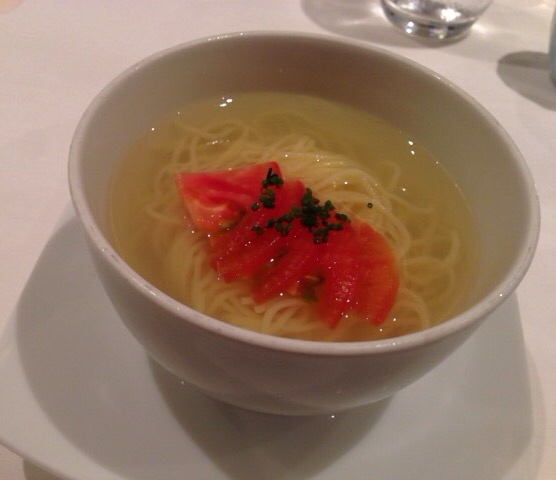 〆の麺は夏季限定のトマトとアサリのコンソメスープの冷やしそばでさっぱりと。