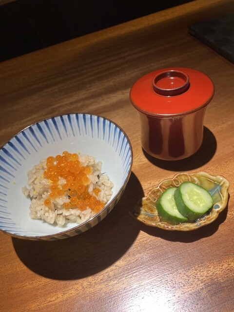 →舞茸?の炊き込みご飯でいくらがたっぷり!柚子のアクセントが心地良く、〆に相応しい優しく上品な味わい。