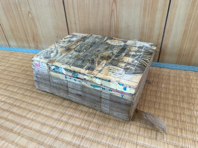 座敷には漫画本を積んでテープで貼った枕があります。