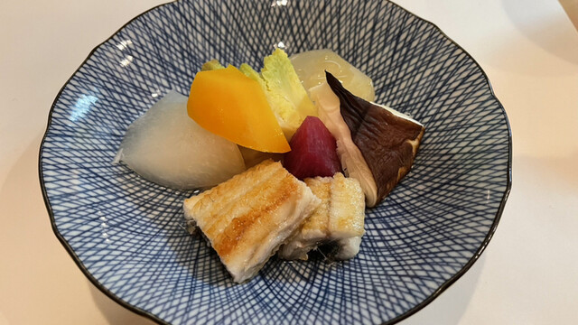 先付けで、素焼したうなぎを温野菜と一緒に味噌風味で。