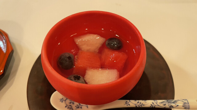 本命のうな重と同時に、漬物、肝吸いが出されてきまして、食後にお茶とデザートでした。デザートは、清涼なフルーツゼリー。