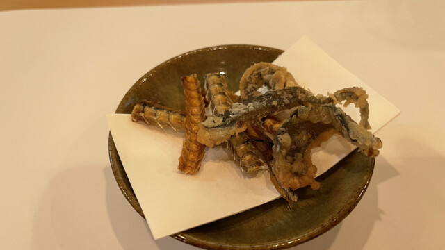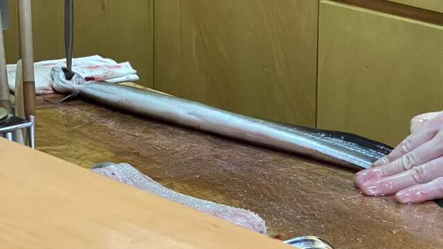 カウンターが見えるので、目の前で活きた鰻が捌かれて、チリチリといい匂いで焼けるのを待ちながら、前菜を頂く。