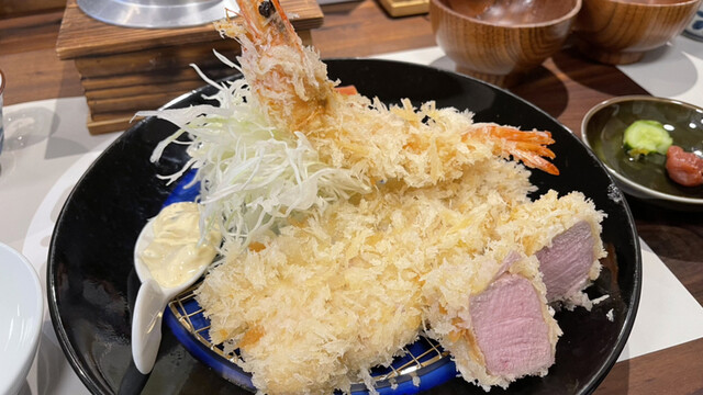 本命のカツは、衣が白く光りレアギリを攻めて、さらに良い油の甘さと芳醇さ。柔らかくもジューシーなヒレ肉、脂身が甘いロース。