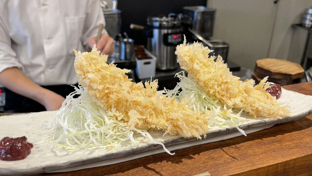 両方とも岩塩や藻塩でいただくと、ご飯とあわせて、極上トンカツを食べたときに感じるほっぺたが落ちる感覚を頂ける。また、タルタルでいただくエビフライもプリプリと豚とは違う食感で当然おいしい。