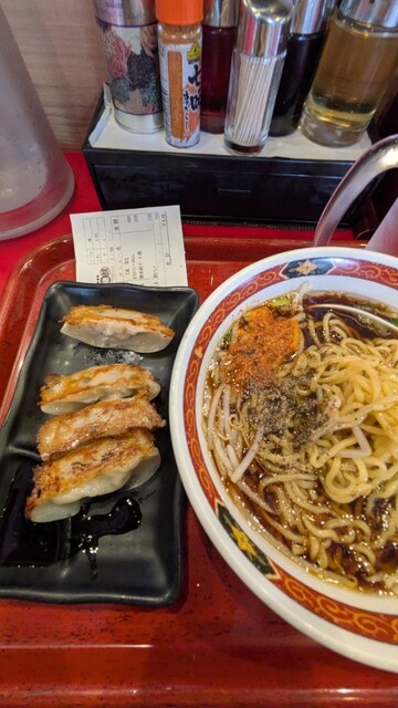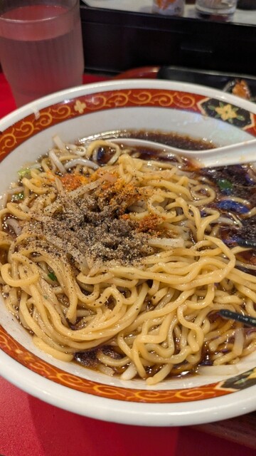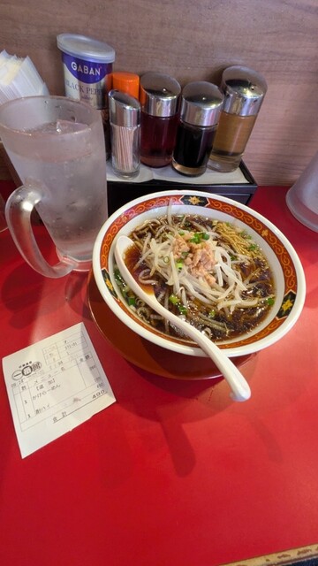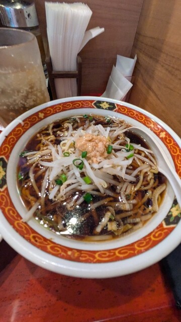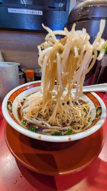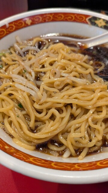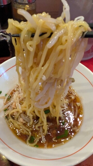 みたいな感じかなぁ〜って思った。日高屋の中華そばより…見た目は、濃い口醤油だけど甘いスープ。麺は、インスタント麺の明星食品/中華三昧みたいな感じで…コレはコレで美味しい。トッピングは、茹でもやし&挽き肉少々。