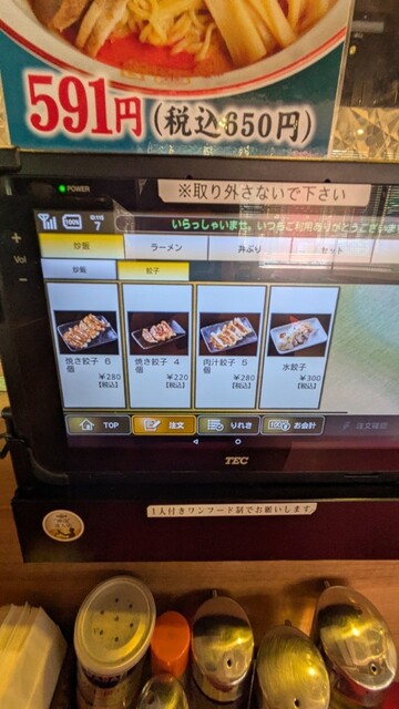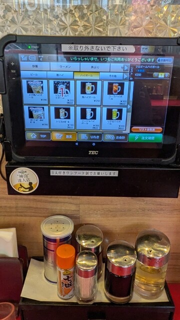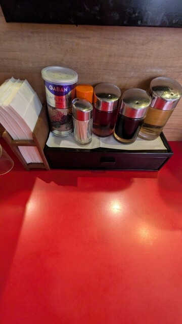 卓上調味料は、醤油・ソース・酢・胡椒・七味唐辛子で町中華スタンダード。普通に綺麗でした。