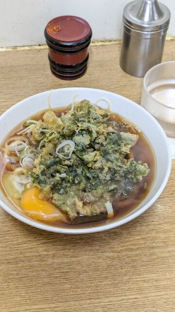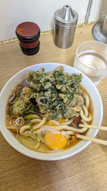 さっき…春菊を注文したけどトッピングされてなかったので、改めて春菊に生玉子を注文。うどんも生玉子も…普通。スープは、そばと同じ甘じょっぱいだし。