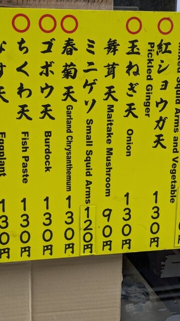 ※普通の山菜は、150円。普通のゲソ天は、200円で…ジャンボゲソ天260円。