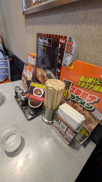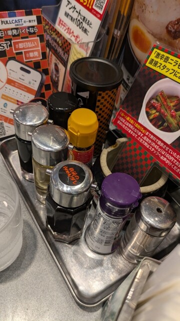 卓上調味料は、綺麗で好感持てます。卓上にあるQRコードを読み込み友達登録画面を見せると1トッピングサービスなので、もやしを追加。辛いニラは、店員さんに言うと無料でもらえます。多分?暑すぎて味が変わるのを避けてると思う。