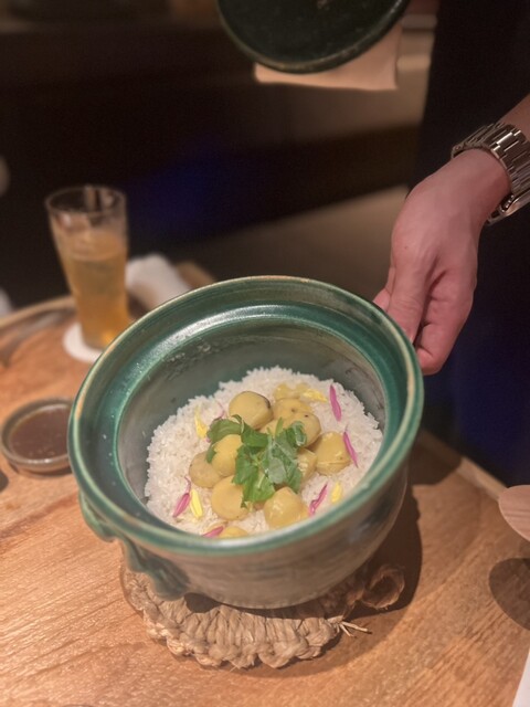 「トロホルモン西京味噌漬け」と「ハツ」も絶品で、締めの「栗の土鍋ご飯」もとっても美味しかった〜