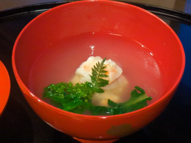 【お 椀】薄葛仕立 寄せ貝柱 海老 京菜花 金箔 木の芽