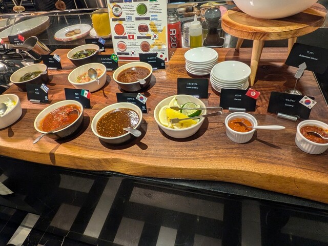 和食では「にぎり寿司」や「ネギトロといくらのミニ丼」、「浅利の炊き込みご飯」などをご提供。洋食ではお客様自身が具を選んで作る「タコス」や旬の食材を使用した「自家製パスタ」などをライブキッチンにて用意、躍動感を感じられるエンターテインメントの一つとしてもお楽しみ。その中でもビュッフェメニューとして提供するシーフードの多くは、地元にある市場で仕入れた新鮮な魚介類を使用、地産地消。シェフが素材それぞれにあわせた方法で丁寧に調理、「アクアパッツァ」や「ムニエル」など、素材の旨味を十分に引き出した逸品。