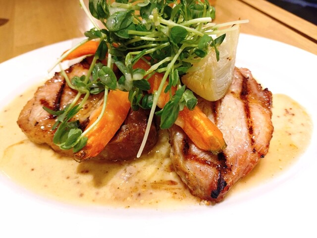 豚肩ロースは厚く、ジューシーでボリュームも満点。付け合わせの野菜もしっかりと調理されていてレベルが高い。ただビジュアル重視なのかサラダも豚もこんもり盛られたカイワレは正直いらなかった。カイワレの根腐さがマイナスになっている。これがクレソンとかだと百点満点なんだけど流石にこの価格だと難しいか。